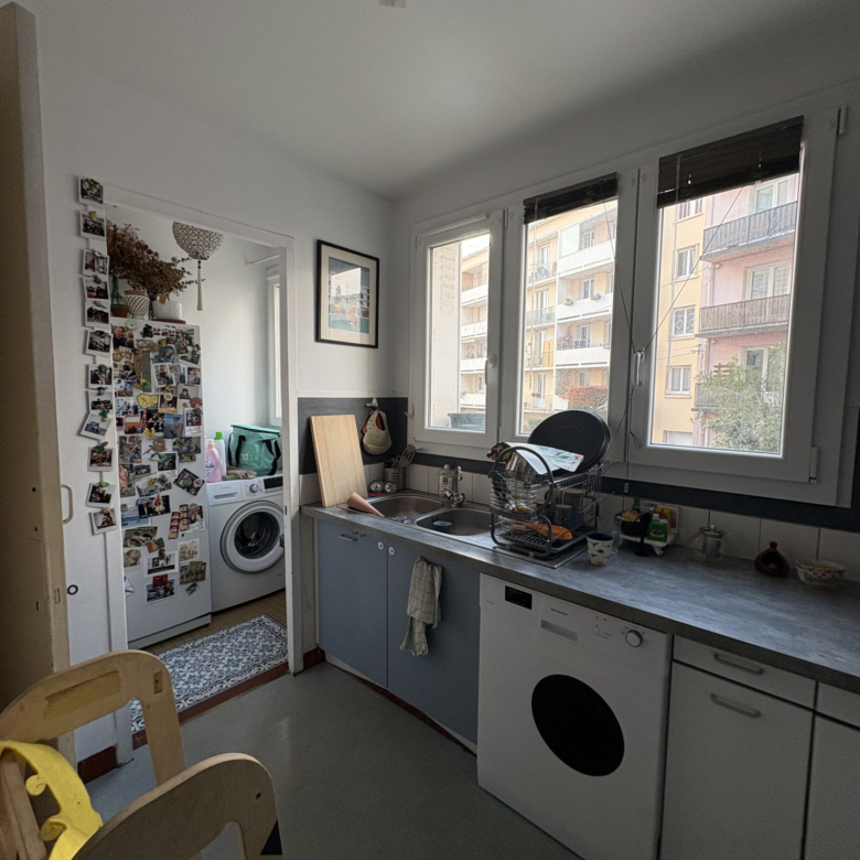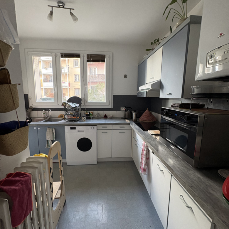 L’appartement est traverssant, il se compose d’une entrée, d’une cuisine séparée et aménagée avec rangements,d’un séjour avec accès à 2 balcons, d’un couloir desservant deux chambres, une salle de bains et un wc séparé.