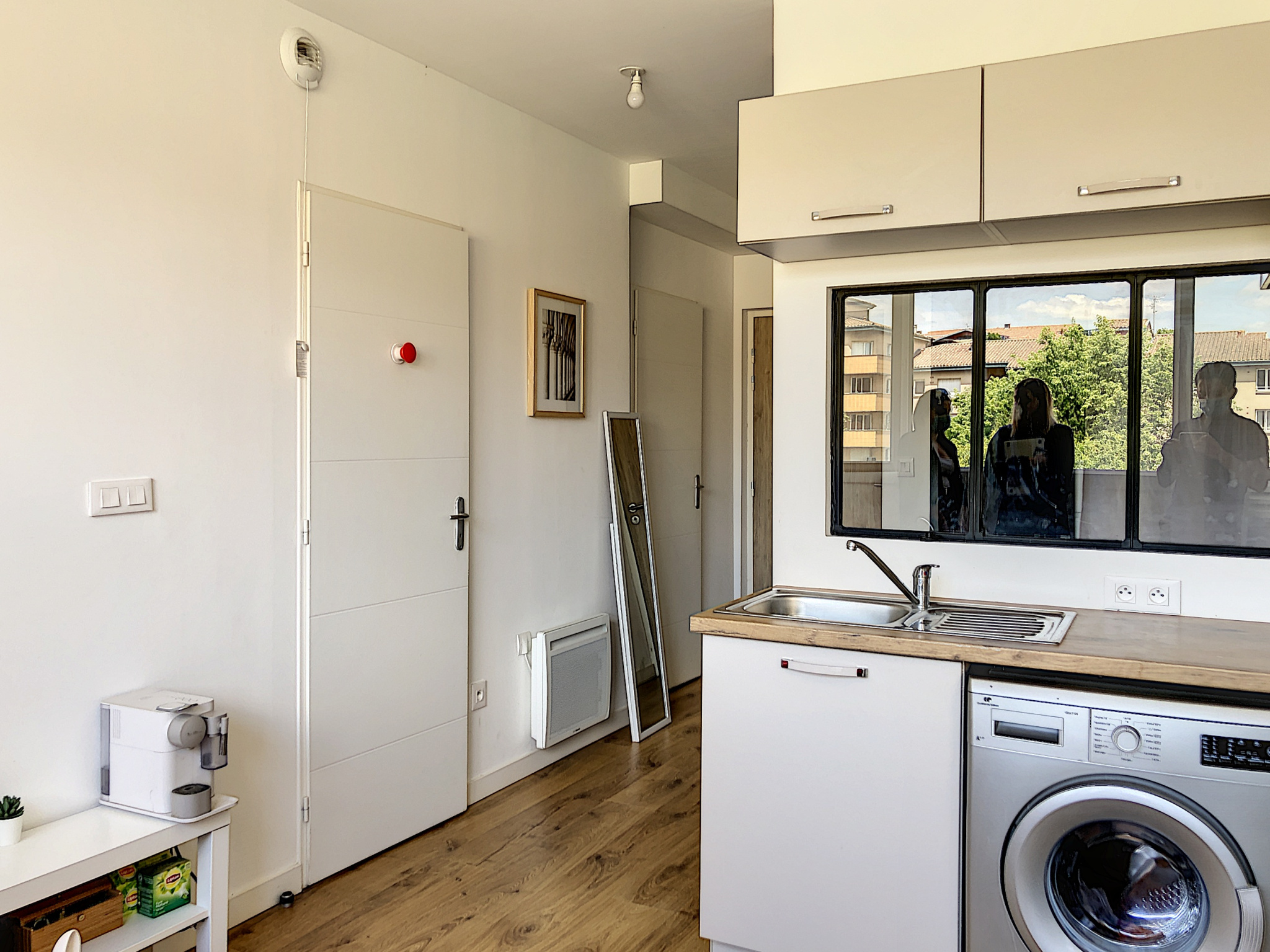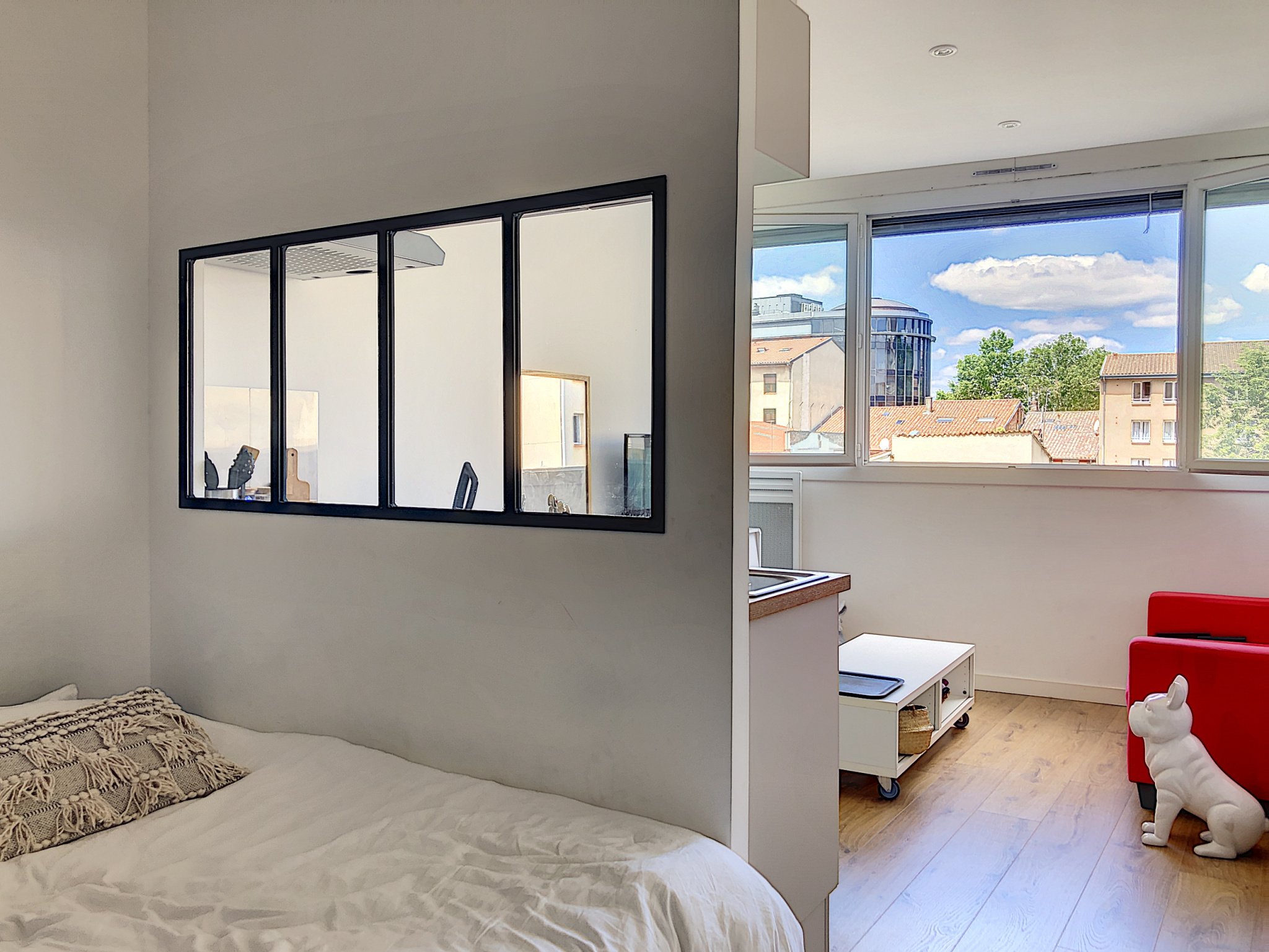 L’appartement est composé d’une pièce principale avec un coin séjour avec cuisine ouverte et équipée, d’un coin nuit avec armoire, d’une salle d’eau et d’un WC séparé.