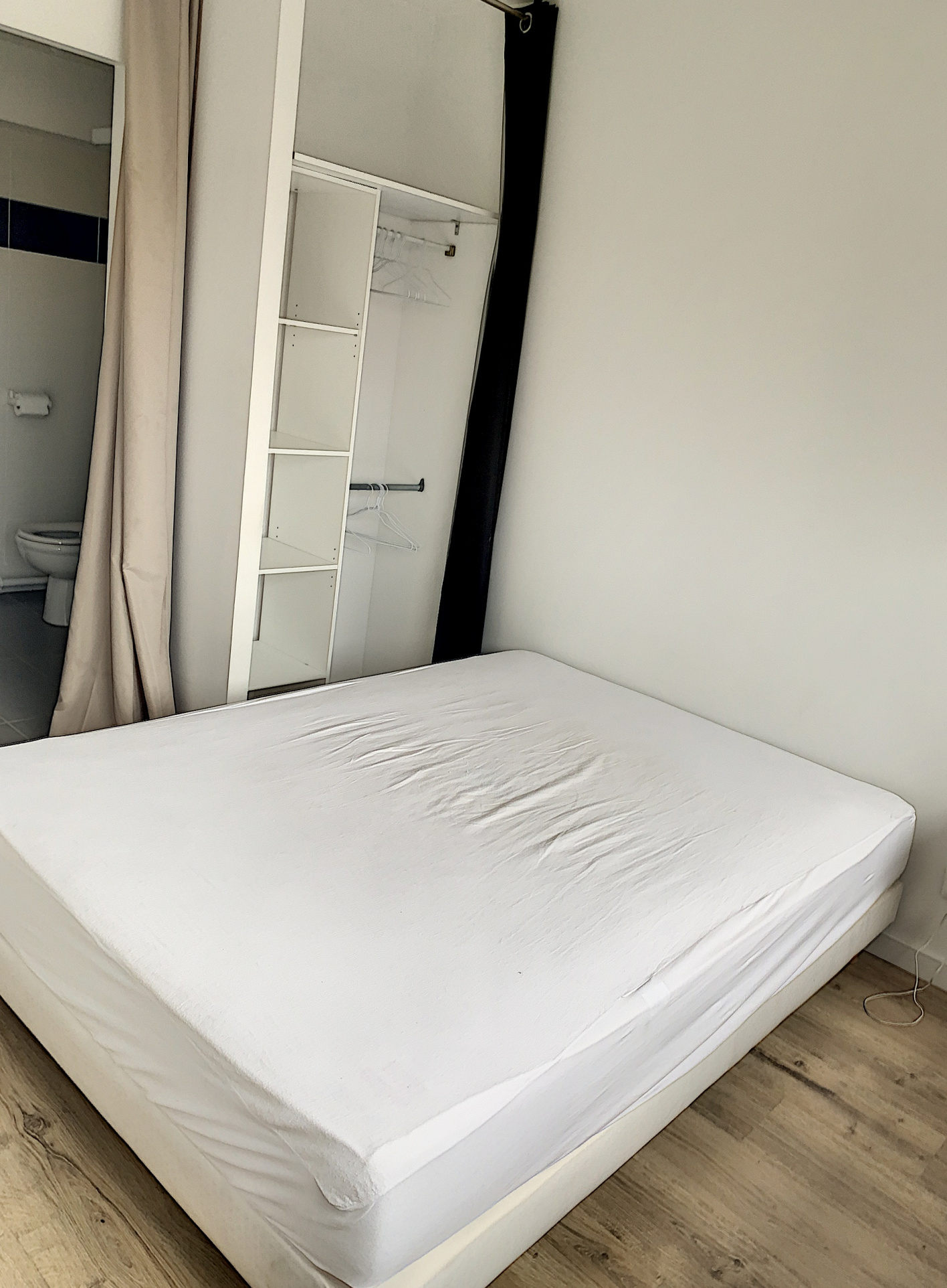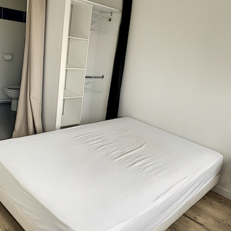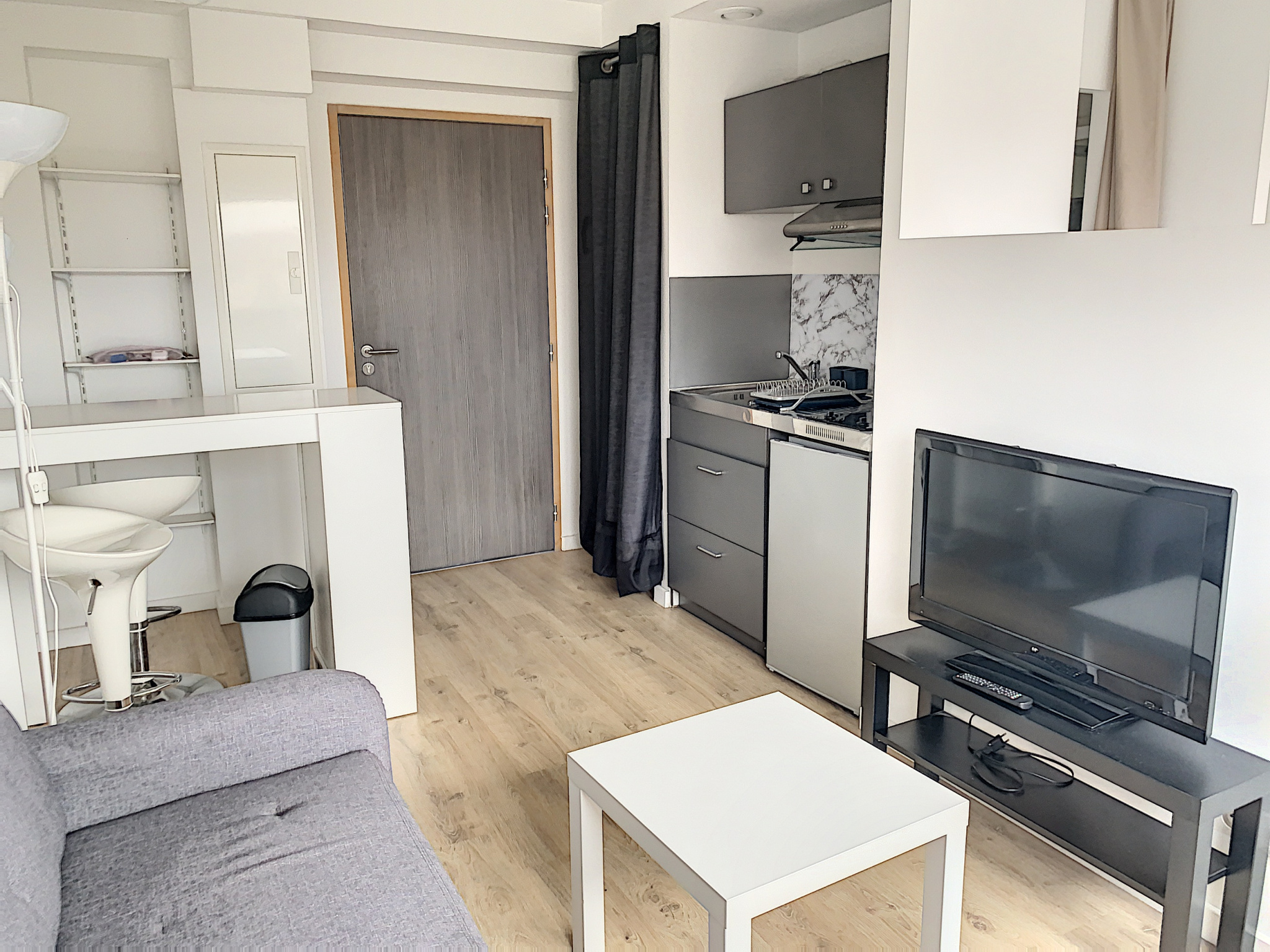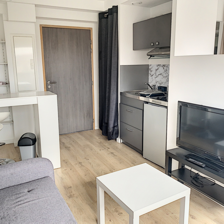 L’appartement est composé d’une pièce principale avec une kitchenette équipée, un coin pour mettre une machine à laver, une partie séjour avec canapé et télévision, un coin nuit avec rangements et une salle d’eau avec WC.