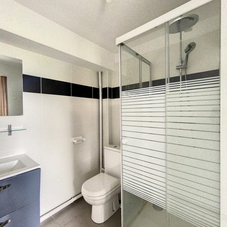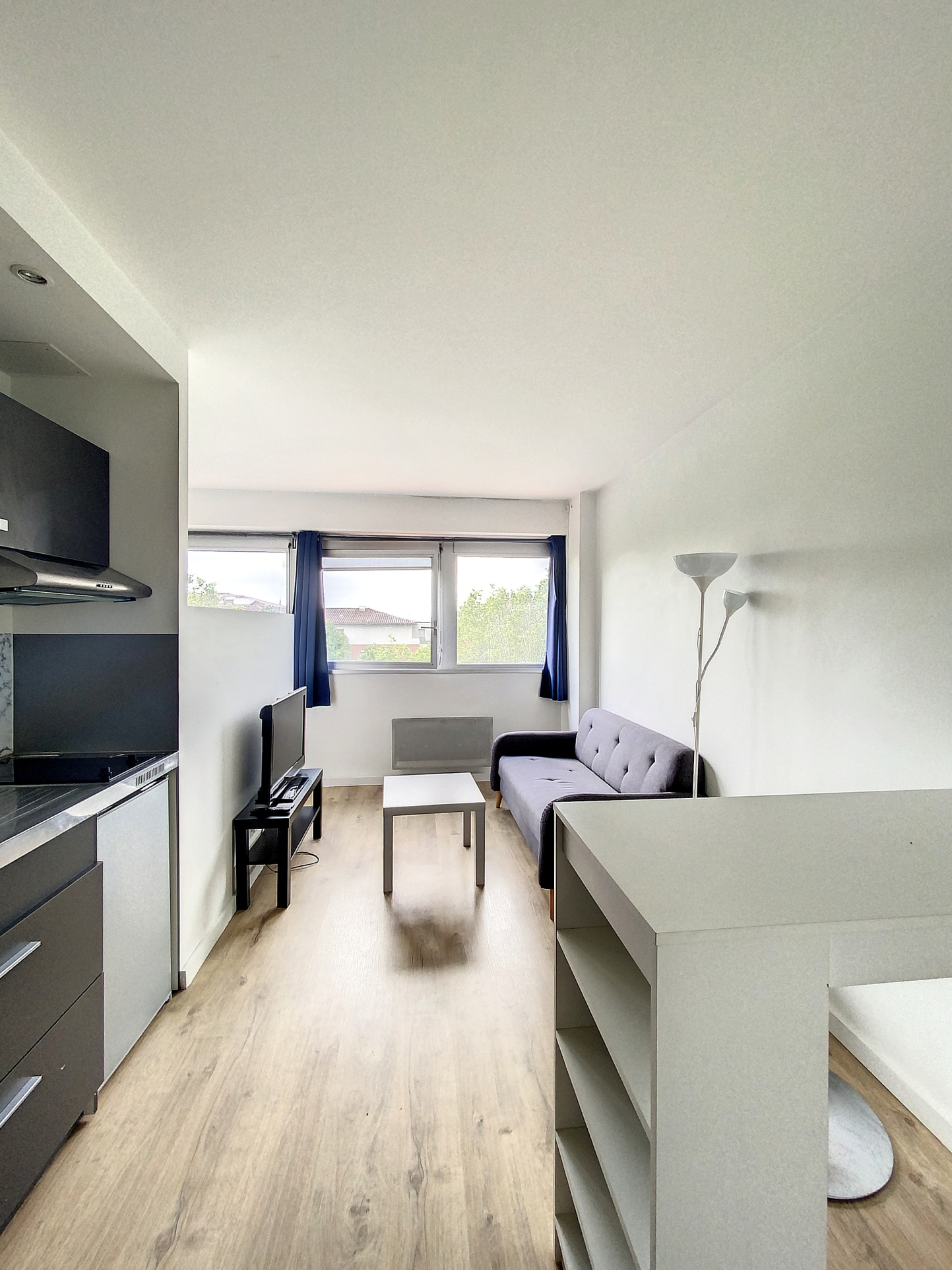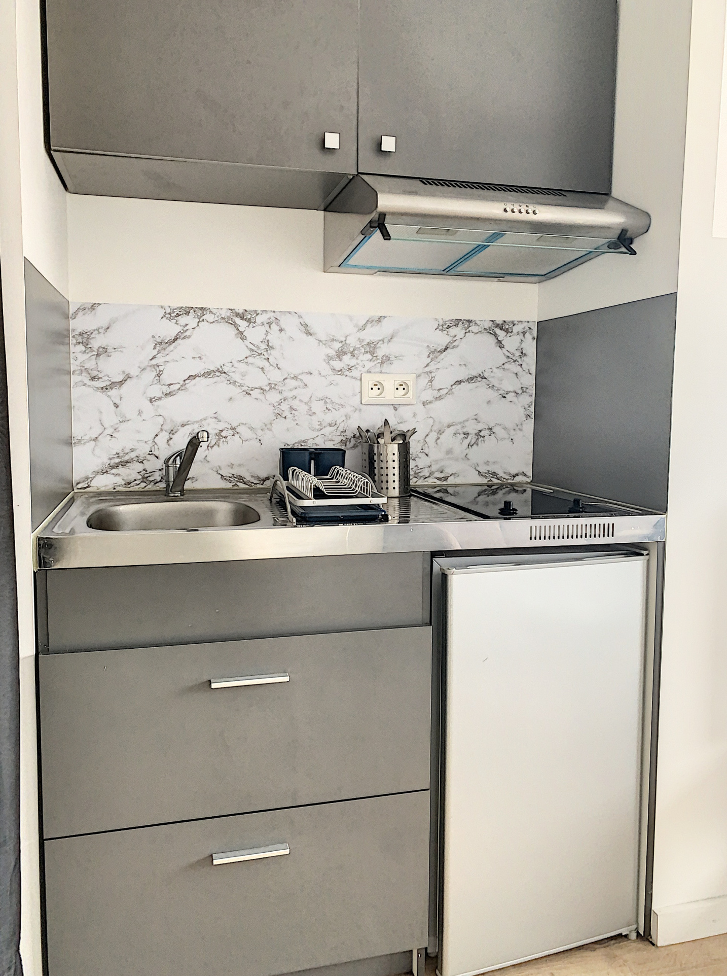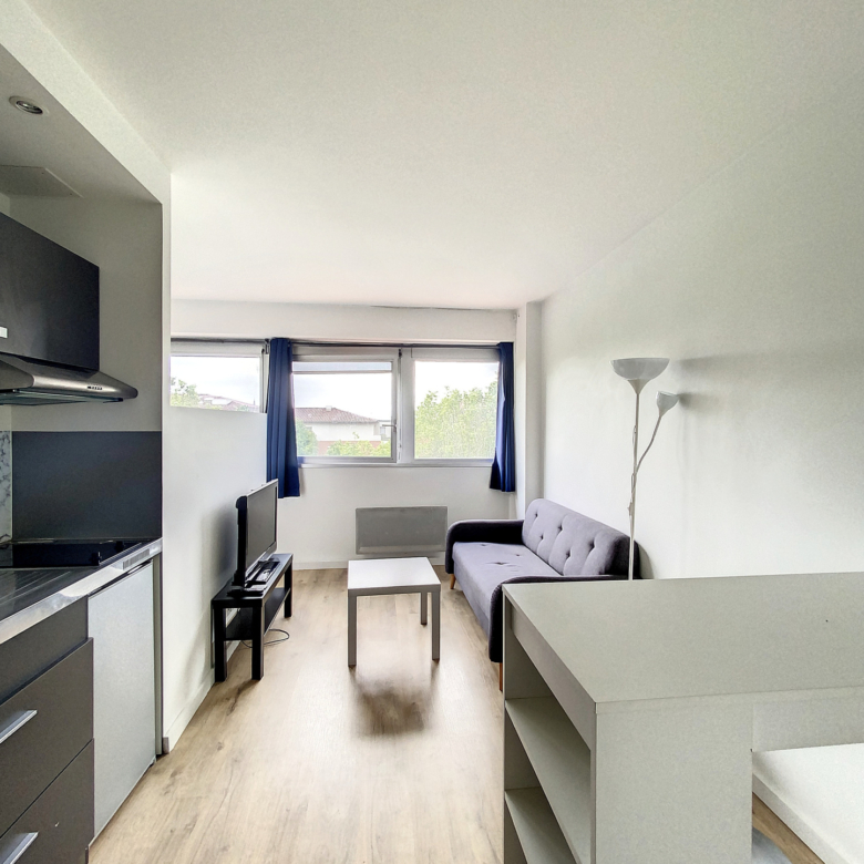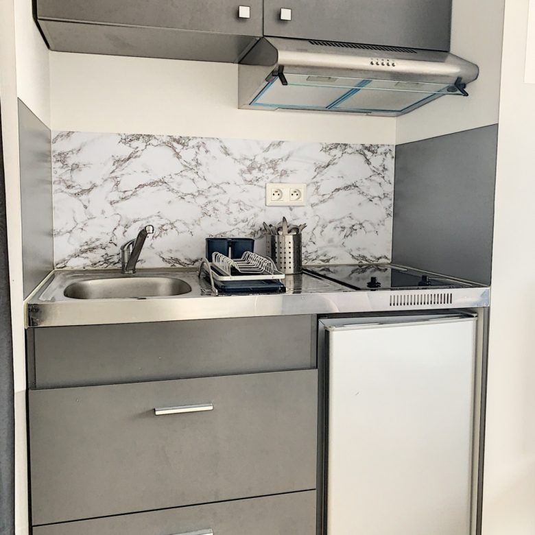 L’appartement est composé d’une pièce principale avec une kitchenette équipée, un coin pour mettre une machine à laver, une partie séjour avec canapé et télévision, un coin nuit avec rangements et une salle d’eau avec WC.