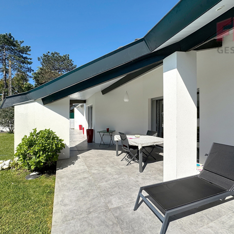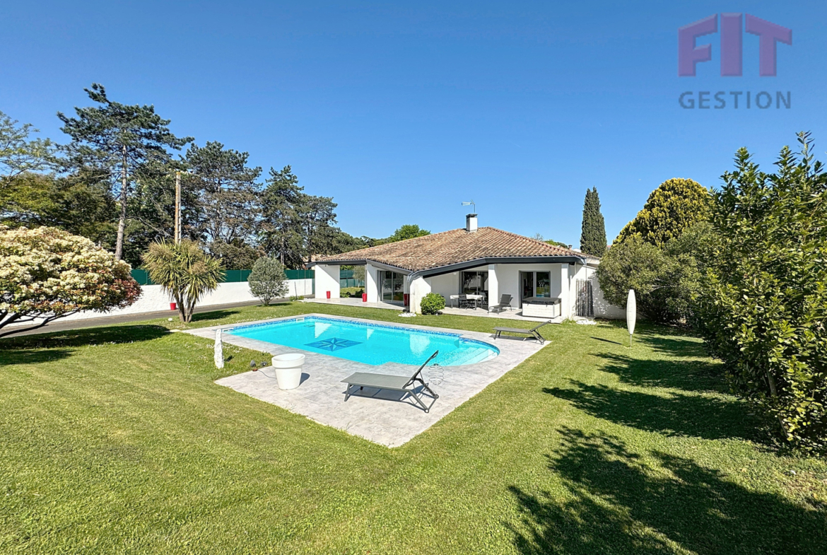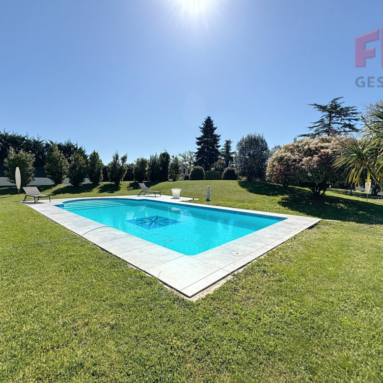 Venez découvrir une villa intimiste située au fond d’un terrain de 3100 m2. Derrière un portail cloturant le terrain, cette belle maison de très belle construction se dresse devant sa piscine et au fond d’un très grand jardin arboré. Cette dernière de 198m2 est divisée en deux points : une partie garage, détennant 3 garages indépendants, et une partie habitable.